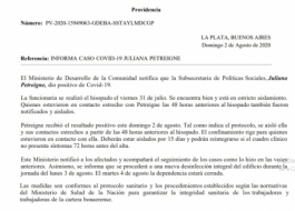 El Ministerio de Desarrollo de la Comunidad de la provincia de Buenos Aires, como ocurrió en los casos anteriores, informa sobre la situación de la funcionaria Juliana Petreigne, tras confirmarse que padece Covid-19.