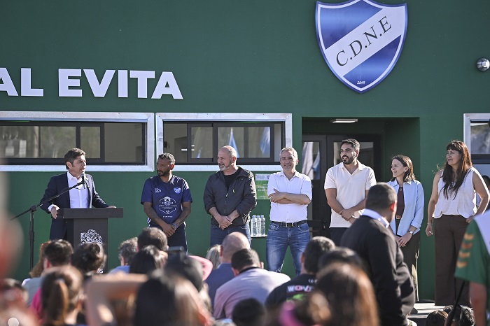 El gobernador de la provincia de Buenos Aires, Axel Kicillof, encabezó este martes la inauguración del complejo deportivo del Club Nacional Evita en el municipio de Ensenada. Fue junto al ministro de Desarrollo de la Comunidad, Andrés Larroque; el intendente local, Mario Secco; el dirigente Hugo Moyano (h); y el presidente del club, Rodrigo Herrera.